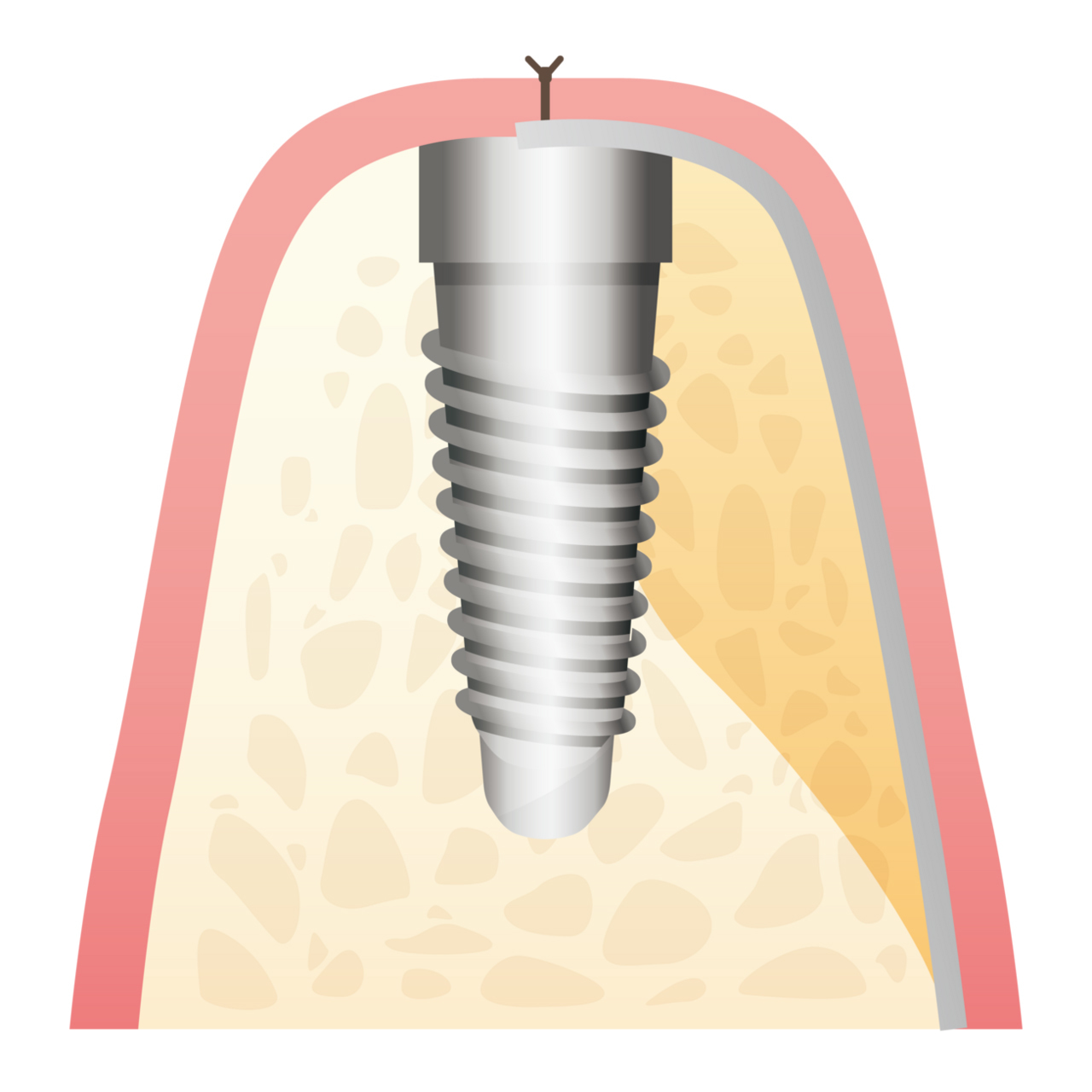 治療の説明:あごの骨が足りない場合に行う。インプラントを埋め入れる部分の歯ぐきを切り開き、中に人工骨(骨補填材)や移植骨を入れて、骨の量を増やす治療法です。